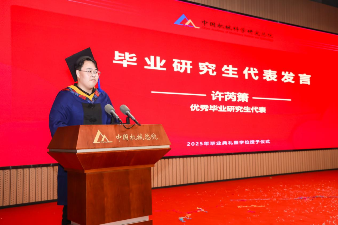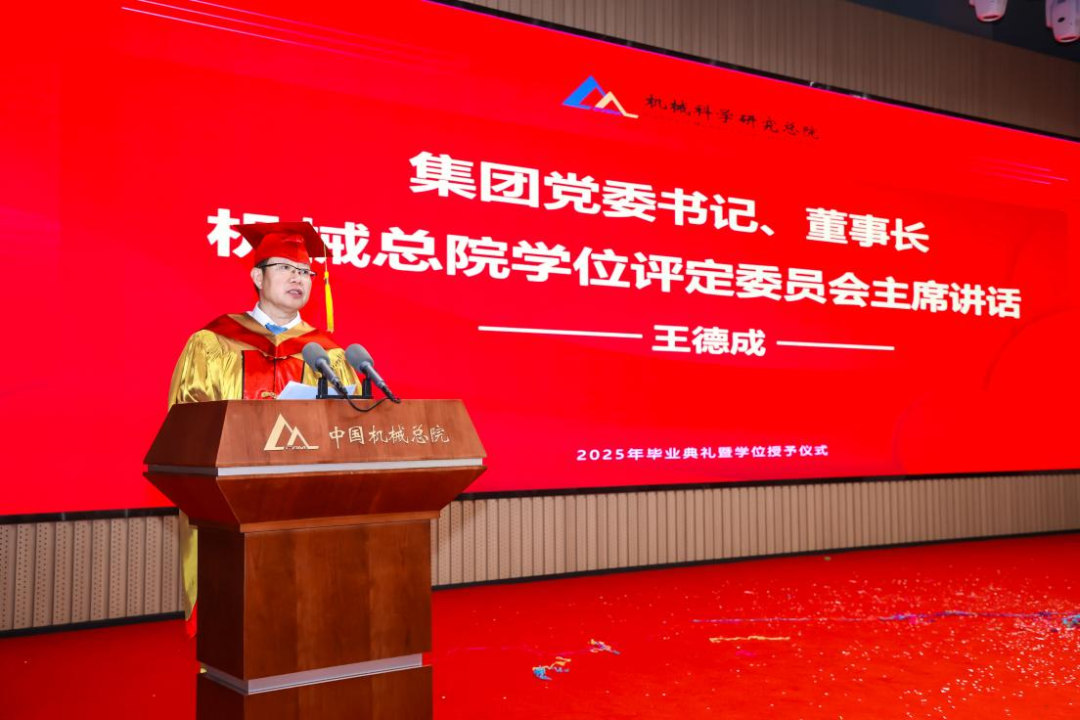 機(jī)械總院學(xué)位評定委員會(huì)主席、集團(tuán)黨委書記、董事長王德成,集團(tuán)黨委副書記、總經(jīng)理孟祥宇,集團(tuán)黨委副書記、董事李玉鑫,集團(tuán)黨委委員、副總經(jīng)理王宇,機(jī)械總院學(xué)位評定委員會(huì)副主席、集團(tuán)副總經(jīng)理李愛國,集團(tuán)副總經(jīng)理姜超出席典禮,機(jī)械總院學(xué)位評定委員會(huì)委員、京內(nèi)外各二級單位領(lǐng)導(dǎo)、導(dǎo)師代表、研究生管理部門負(fù)責(zé)人、2025屆畢業(yè)生及家屬共計(jì)190余人齊聚一堂,共同見證這一重要時(shí)刻。典禮由機(jī)械總院學(xué)位評定委員會(huì)秘書長、研究生院副院長邊翊主持。